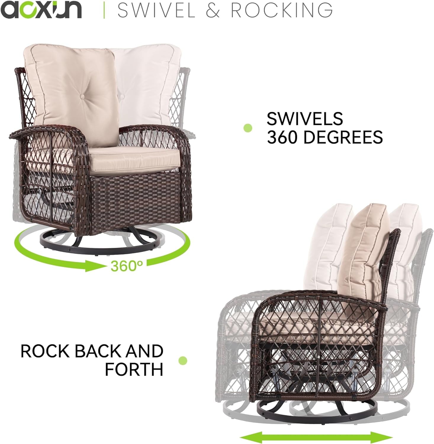 【360° Swivel Rocking Chair】The patio chairs have ability to rotate a full 360 degrees allowing for maximum mobility. Users can easily rotate the chair to face any direction without having to physically move the chair itself. You can fetch things or communicate with friends conveniently.