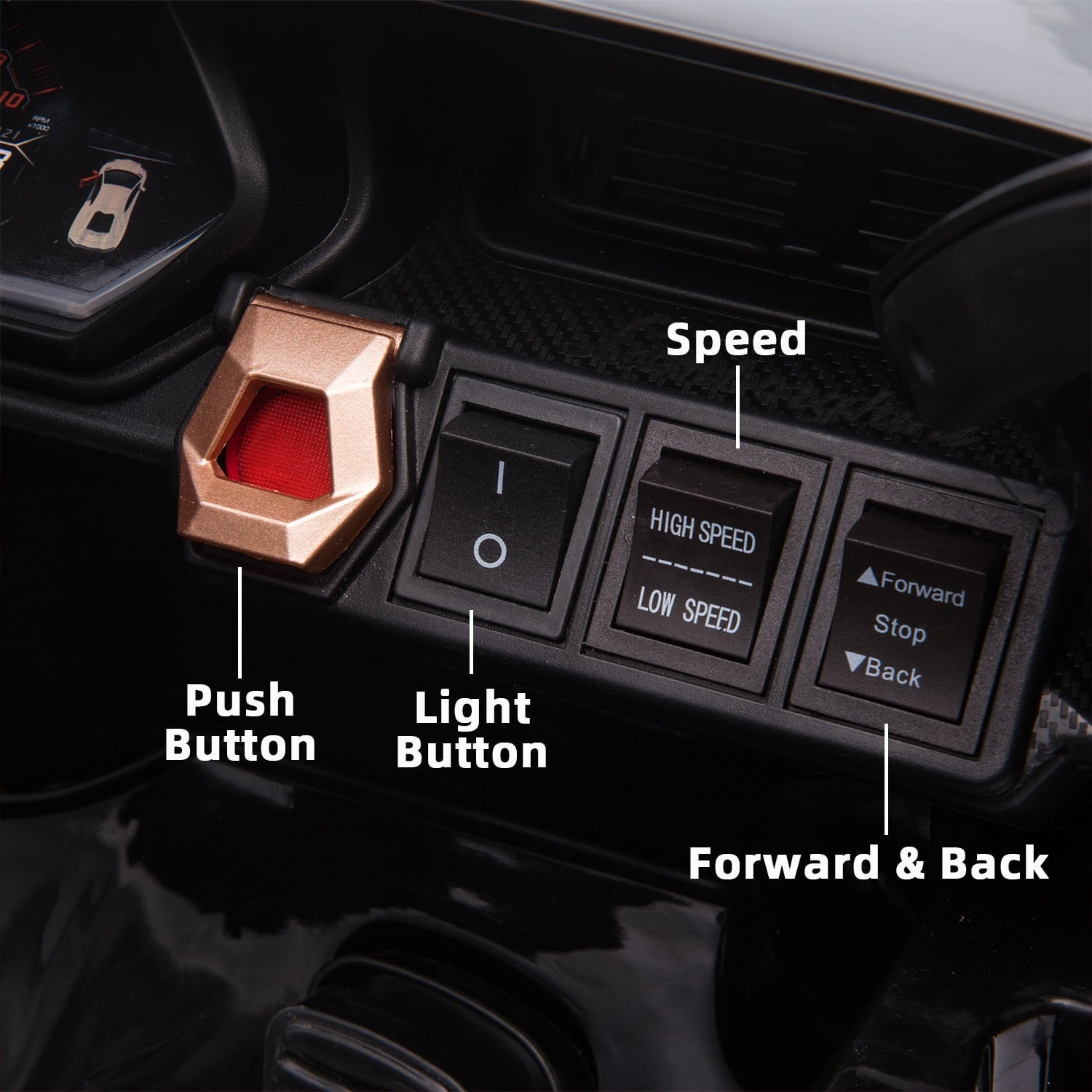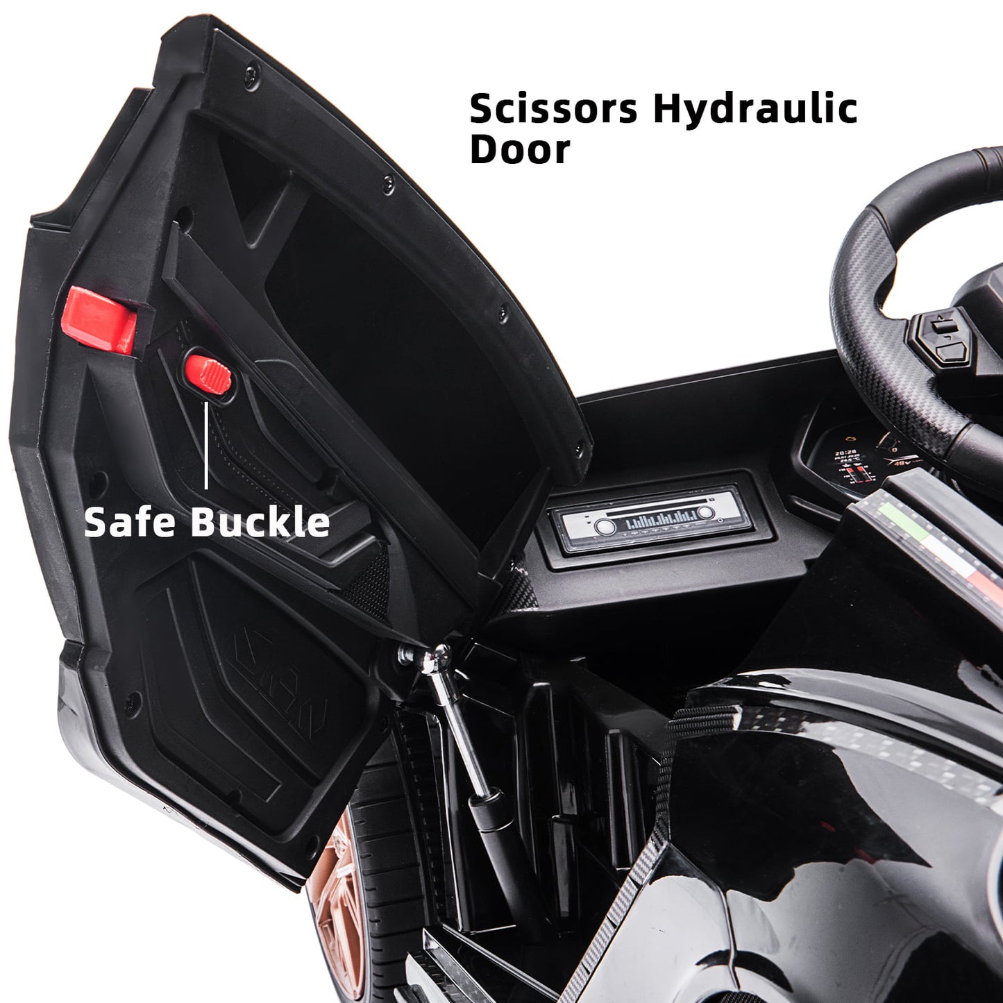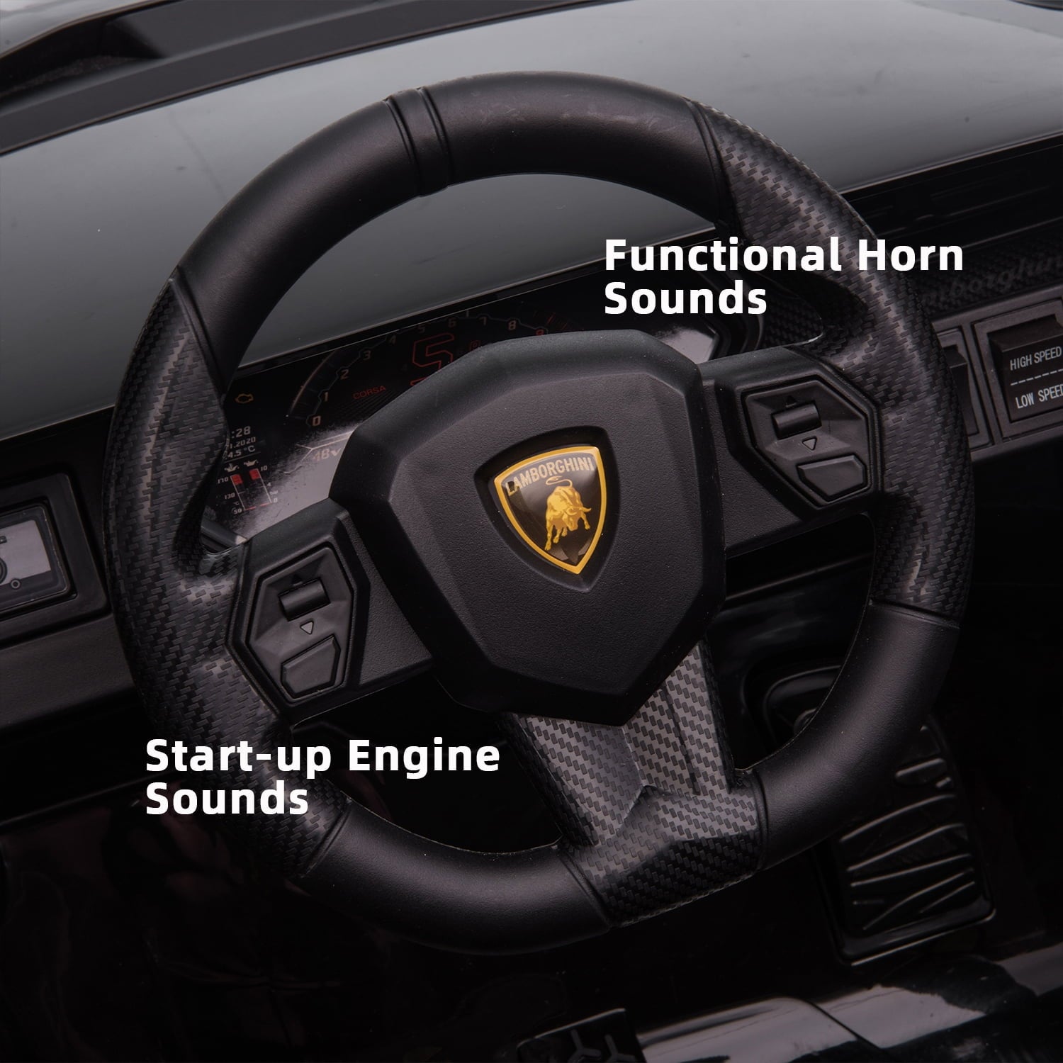 The 12V Electric Licensed Lamborghini ride on car with Remote Control. Electric vehicle including bright front LED lights, robust body kid, customized wheels, upgraded tires for extra shock absorption, seat belts bring an excellent driving experience for unisex child. Play music via USB or FM, AUX functions. Auto power-off protection system increases its safety. Powerful 12V battery, faux carbon fiber body kit,gas pedal, engine sound and horn. 2 gas shock doors that swing up like a real Lamborghini. Best gifts for kids.