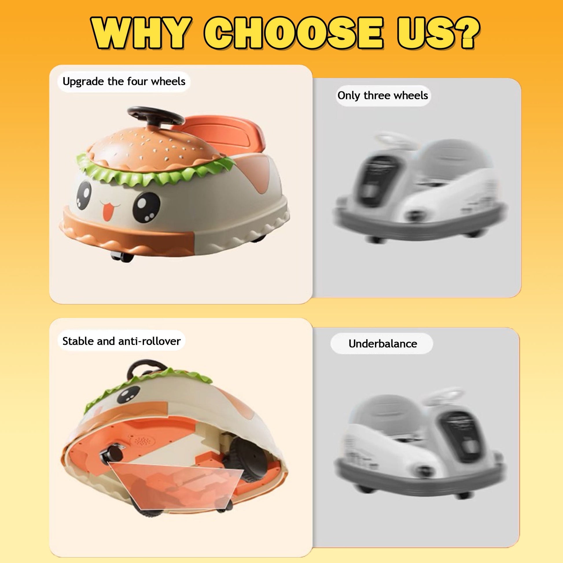 Track 7 hamburger bumper car features a unique and adorable design that kids will love. With 360° spins, music, LED lights, and a rear storage compartment for toys or snacks, it’s perfect for endless outdoor fun. Easy to assemble, this fantastic gift creates unforgettable bonding moments for kids and parents alike. We are committed to providing high-quality ride-on cars—focusing on thoughtful design, durable materials, and reliable after-sales support. Whether it's encouraging imaginative role play, enhancing coordination skills, or simply bringing joy to everyday play, this car makes a perfect gift to inspire confidence and adventure in every child.