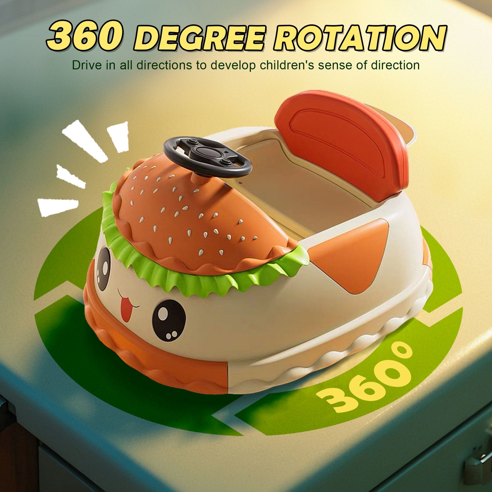 - 【Charming Burger-Inspired Look】Designed to delight, this ride-on bumper car features a playful 3D burger shape—complete with realistic sesame bun textures and cheesy decal details. It’s an irresistible treat for toddlers who love food-themed fun and imaginative play!