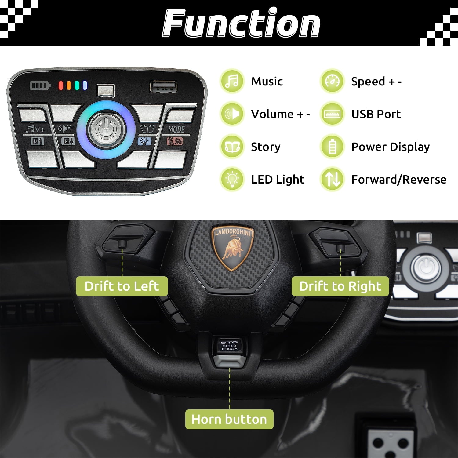 - 【Multifunctional Drift Car for Kids】-The 12V lamborghini STO electric vehicle with Left/Right drift mode on steering wheel.Step the foot pedal and manual the steering wheel, your child can drive the Lamborghini drift car forward and backward easily and independently.