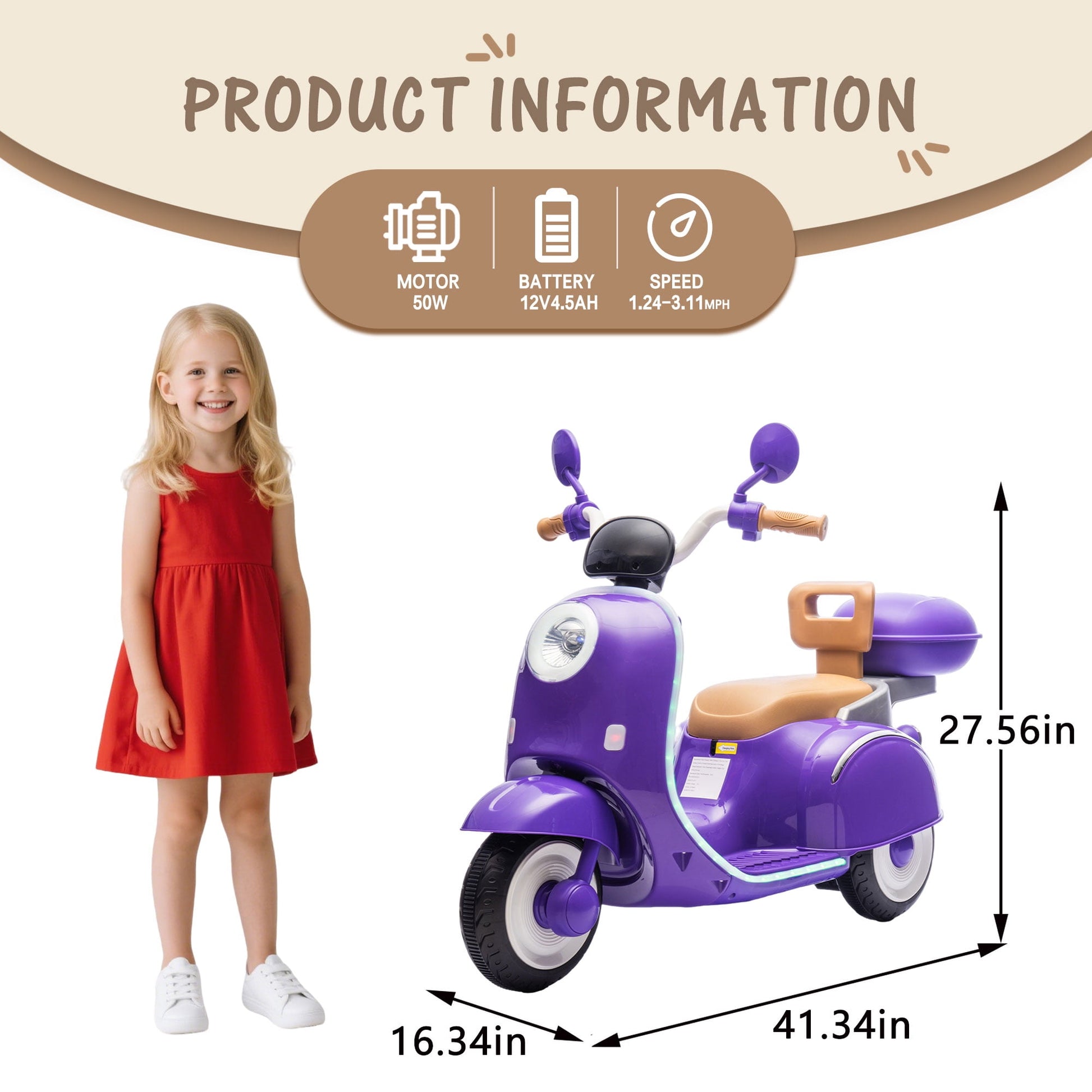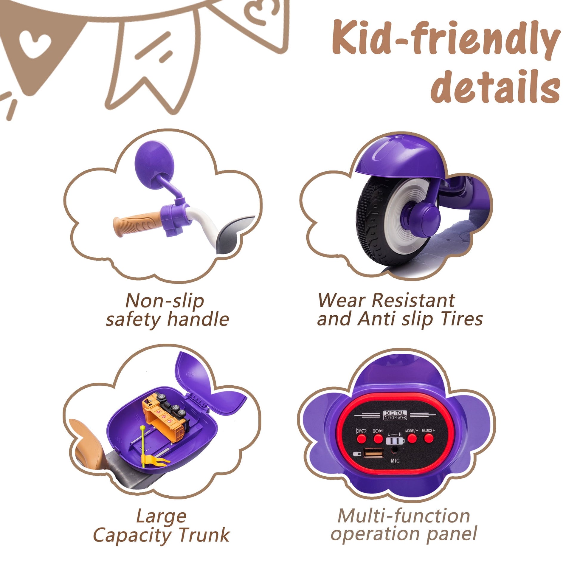 Track Seven 12V Kids Ride on Electric Motorcycle,3 Wheels Powered Motorbike with LED Strip light, 2WD, Anti-Slip Seat, Storage Basket, Bluetooth Music, Parent Remote Control for Ages 3-8, Purple