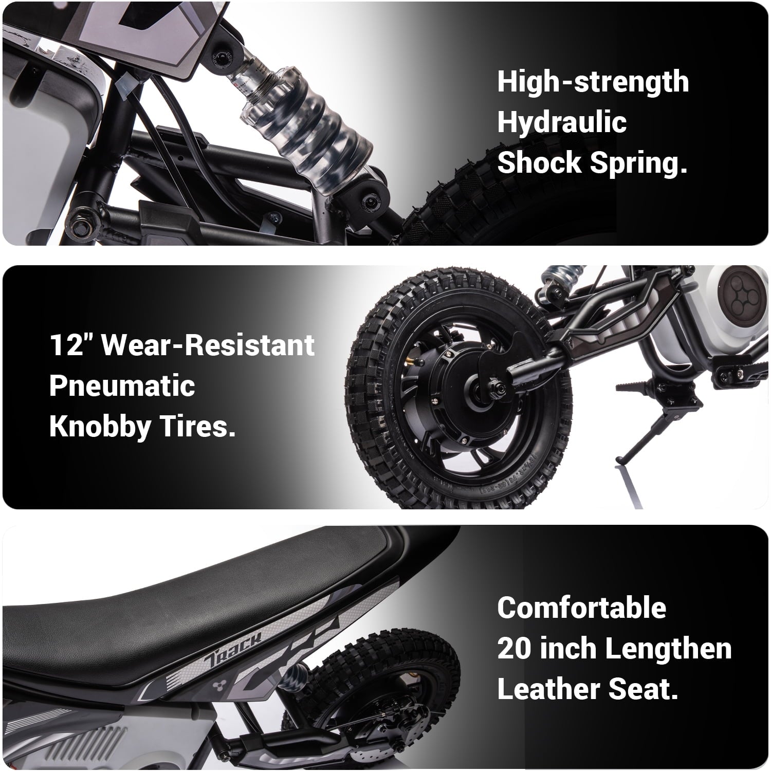 - 【Extra Features】Key start, Soft grips with twist acceleration control for easy acceleration, hand-operated rear brake, shatter-resistant plastic fairings, double crown fork, and retractable kickstand;12-inch pneumatic knobby tires.20" length soft leather seat.