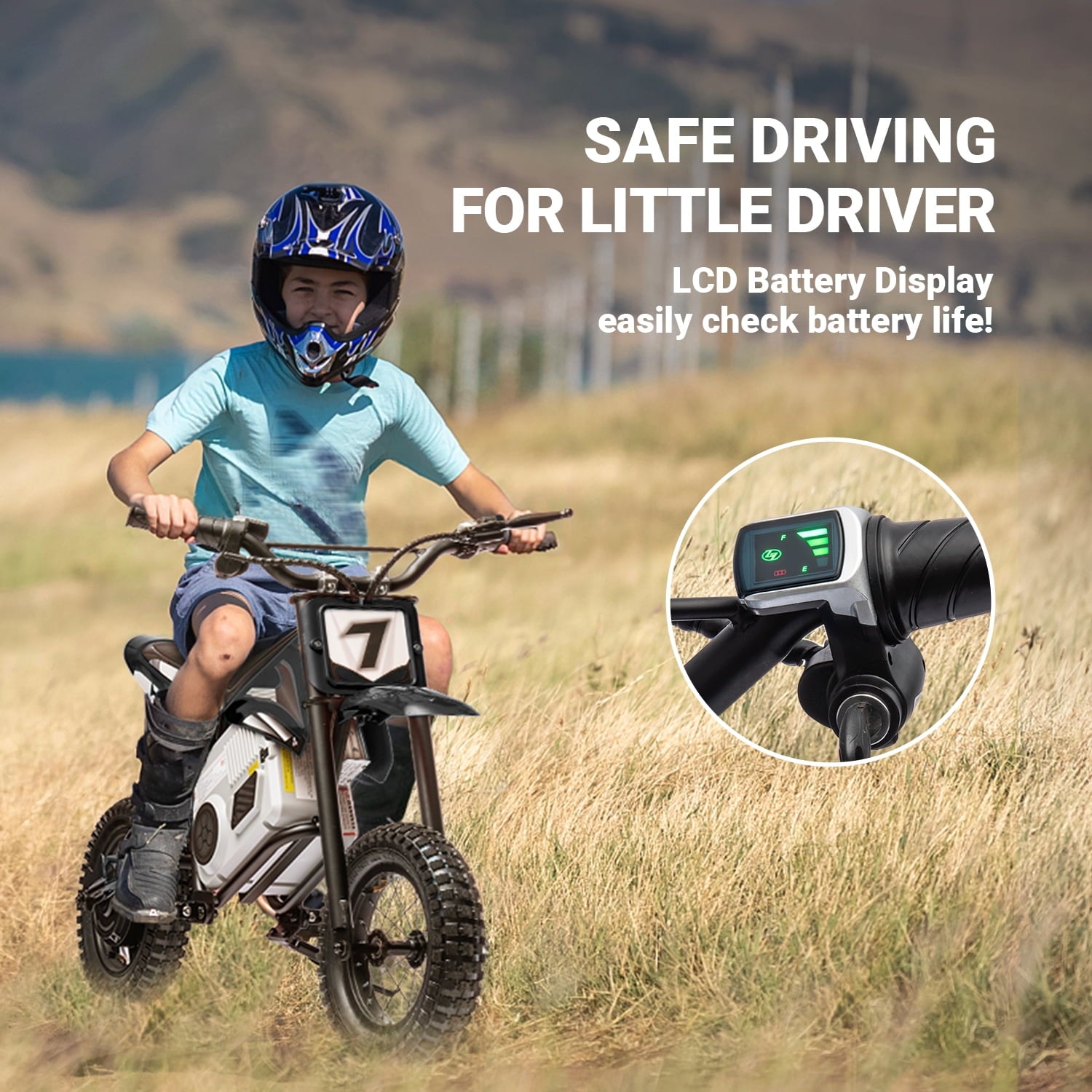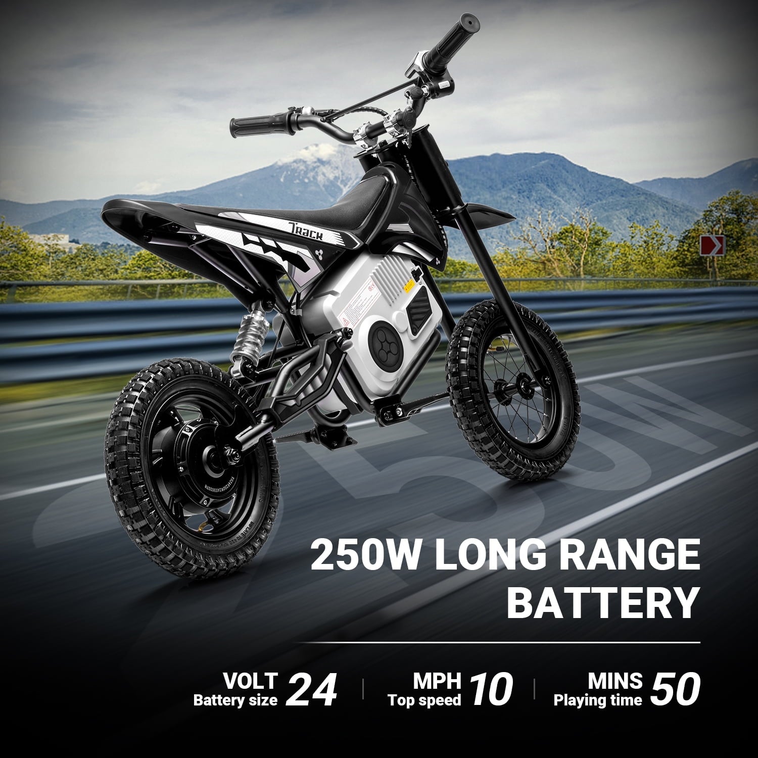 - 【24V & 250W Powerful Dirt Bike】 Powered by a 250-watt, high-torque, variable-speed, chain-driven motor that delivers electrifying fun at speeds up to 10 mph. Max load 176lbs. For unisex child age 8+. (Note: That not be permitted for road use or commuting. Children should wear elbow and knee pads and a helmet (not included in the product) while riding. Please pay attention to safety while riding.)