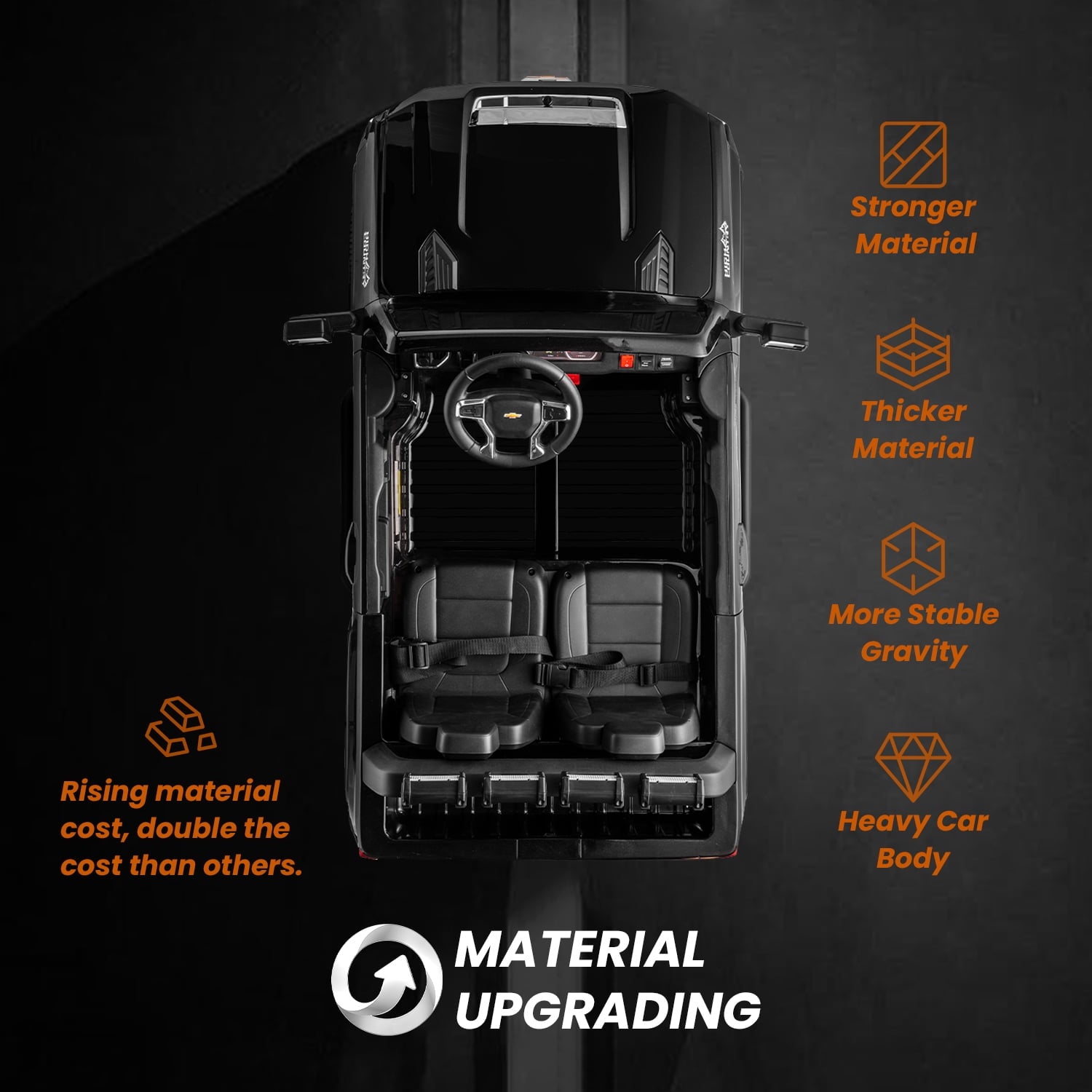 - 【Official Licensed Chevrolet Silverado HD Kids Ride On Car】Chevrolet Silverado ride-on car looks like the real version. LED lights, startup sounds, and openable doors,openable front engine cover deliver an authentic driving experience that kids are sure to love. Crafted with a durable PP plastic body and certified by ASTM F963.