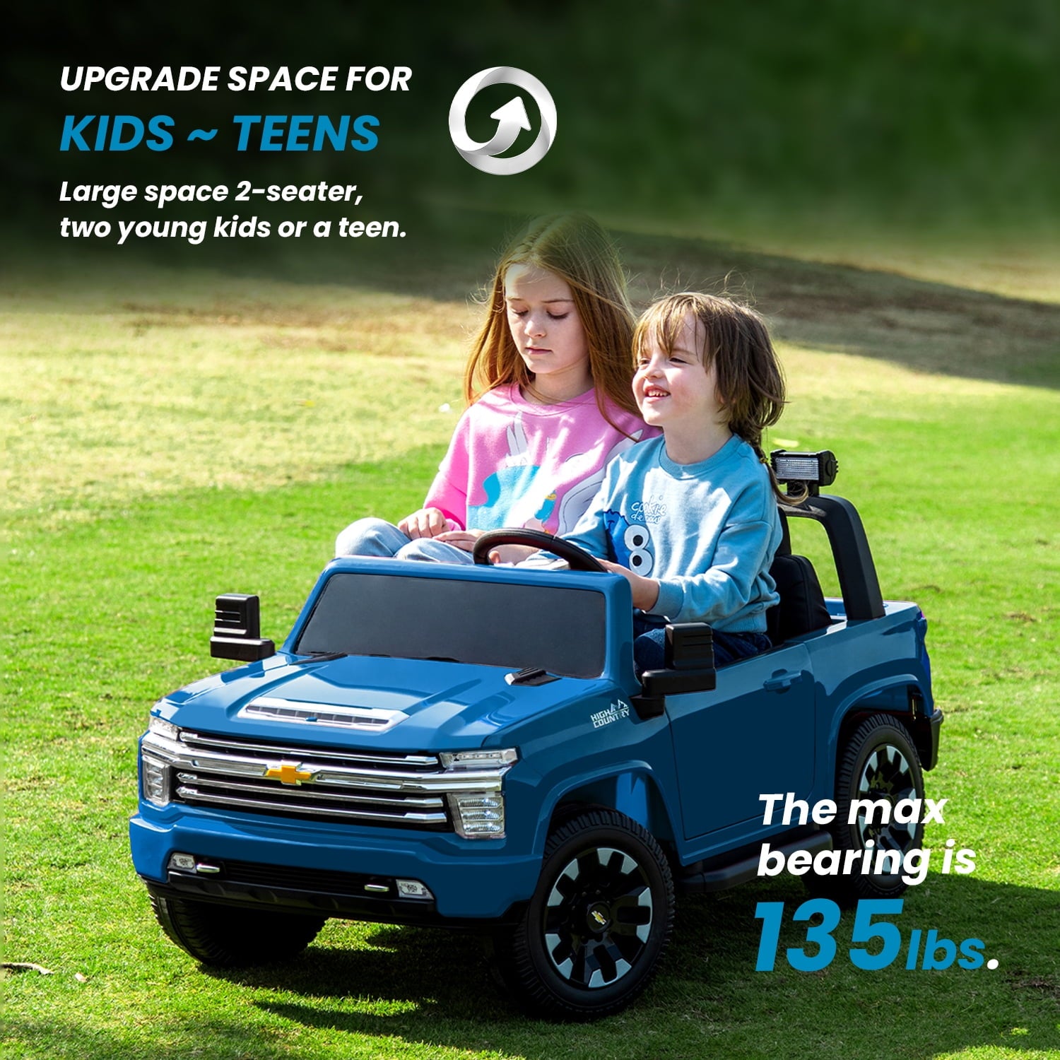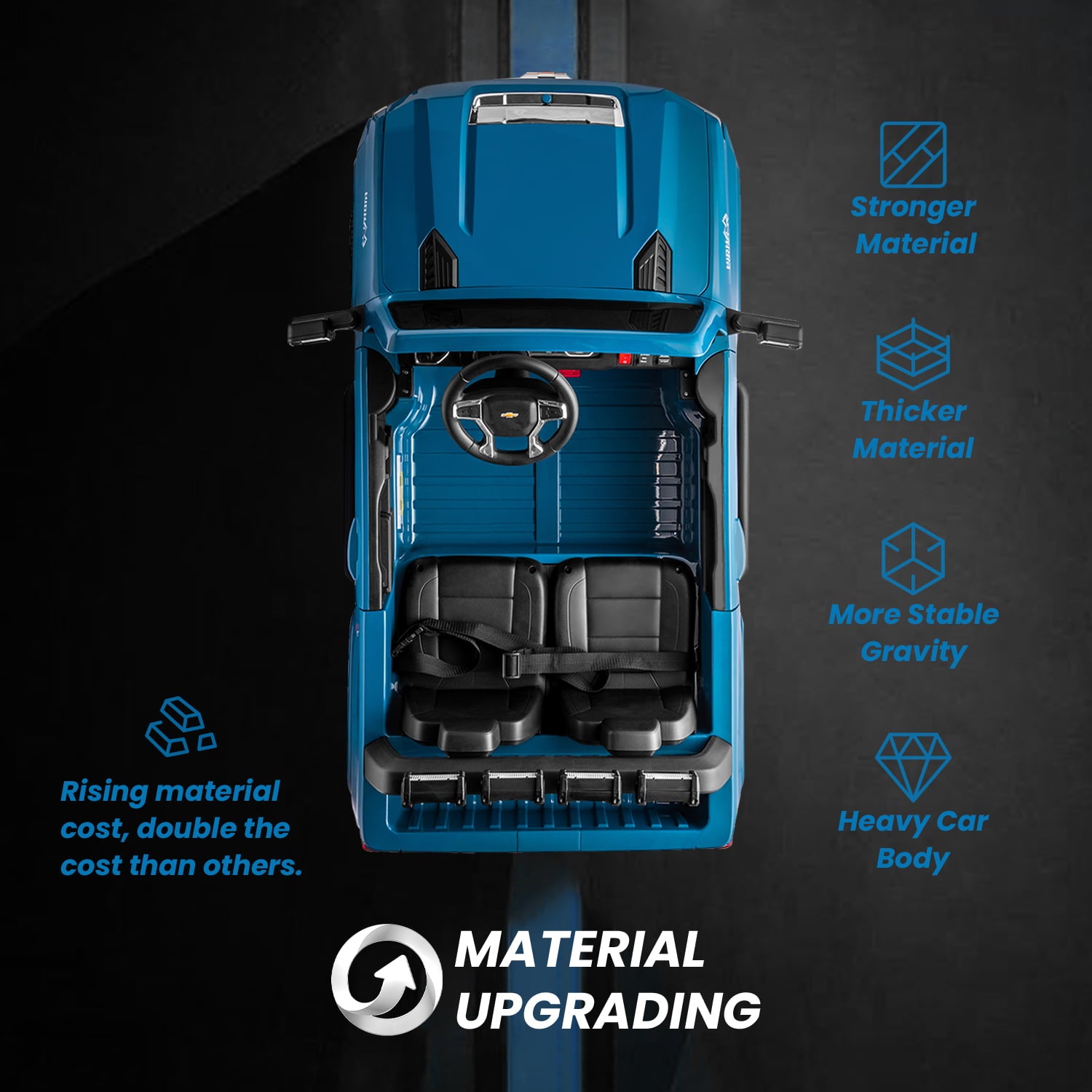 - 【Official Licensed Chevrolet Silverado HD Kids Ride On Car】Chevrolet Silverado ride-on car looks like the real version. LED lights, startup sounds, and openable doors,openable front engine cover deliver an authentic driving experience that kids are sure to love. Crafted with a durable PP plastic body and certified by ASTM F963.