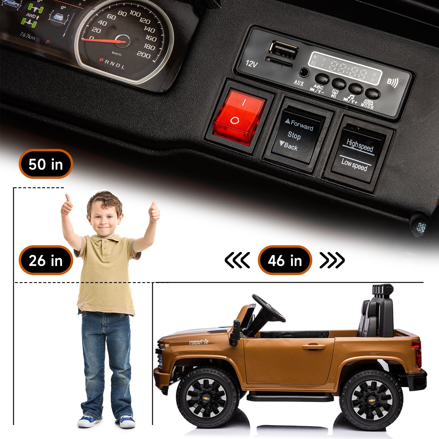 - 【24V Chevrolet Ride on Truck with Funny Functions】This Licensed Chevrolet ride on truck built in working rail lights and a multifunctional radio: built-in music,ABC kids song. Additional,allows you to play kids' favorite music or stories through the device connections like AUX and USB port.Funny driving for unisex child.