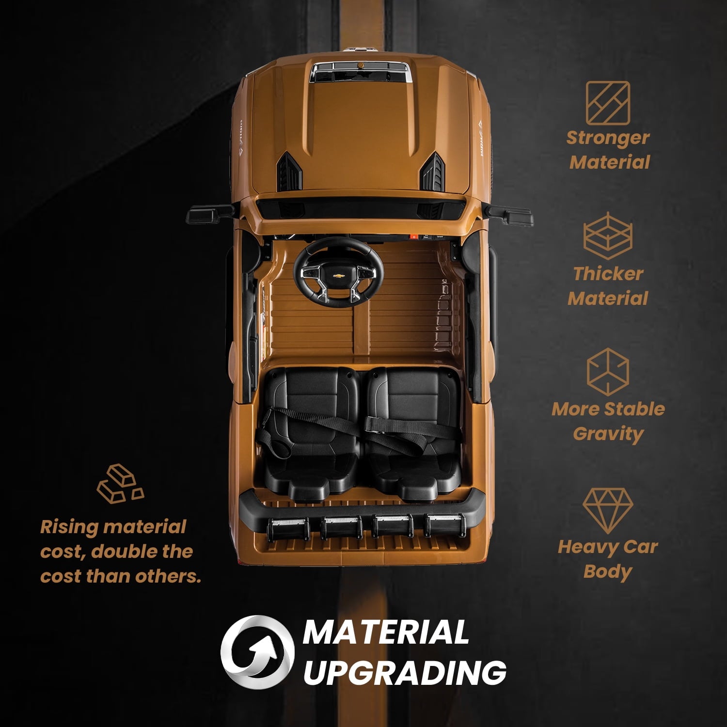 - 【Official Licensed Chevrolet Silverado HD Kids Ride On Car】Chevrolet Silverado ride-on car looks like the real version. LED lights, startup sounds, and openable doors,openable front engine cover deliver an authentic driving experience that kids are sure to love. Crafted with a durable PP plastic body and certified by ASTM F963.