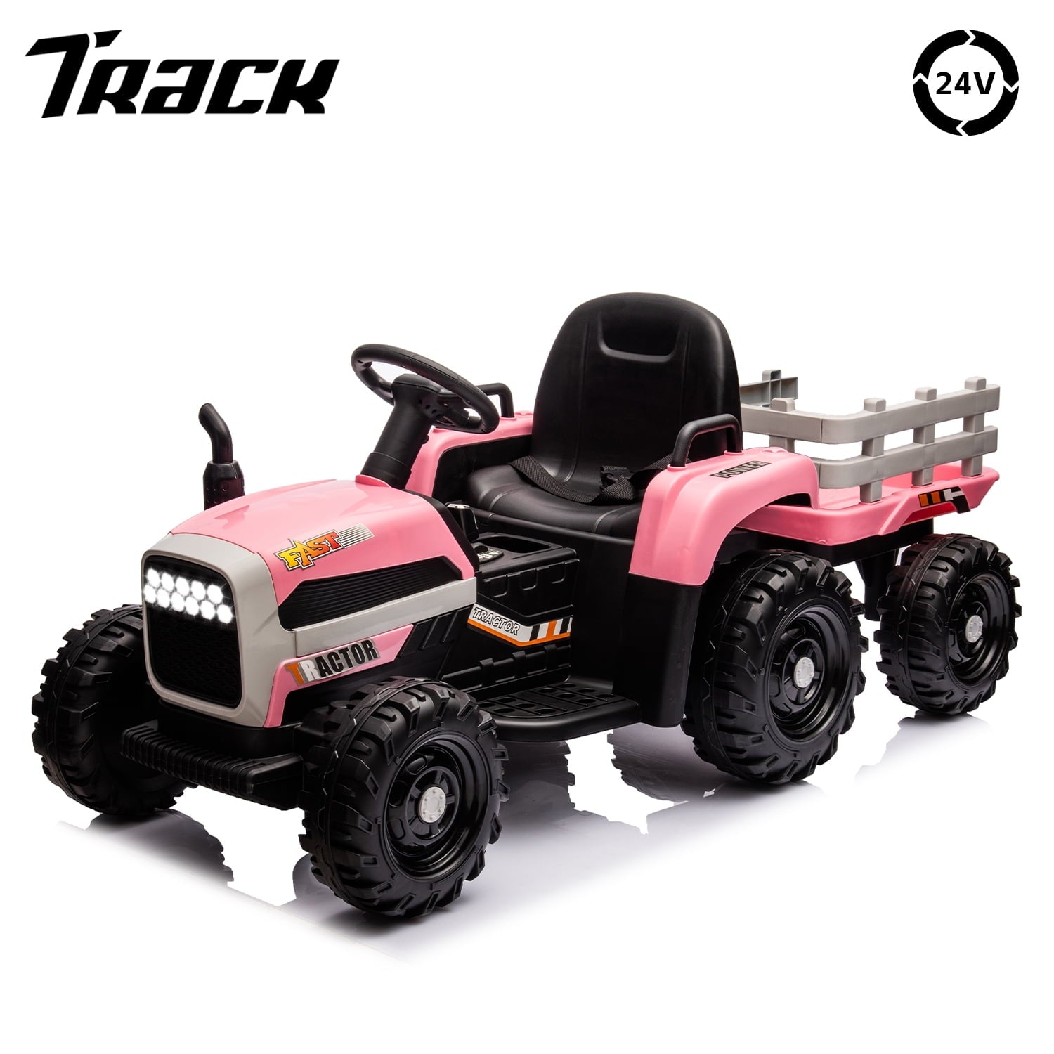 Our 24V Ride On Tractor Car w/Trailer, Kids Battery Powered Electric Vehicle Toy w/400W Motor. The remote controller is designed with a focus on safety, ensuring a reassuring driving experience for your unisex child. One-key start for quick and hassle-free initiation, allowing your child to embark on every adventure with ease. The electric vehilce equipped with an independent light switch, adding a cool and personalized touch to the driving experience. Flexible forward and backward functions create a realistic driving feel, enabling your child to effortlessly master driving skills. 5 mph. Effects: Designed with eye-catching lighting effects, elevating the entire driving experience to an exhilarating level.