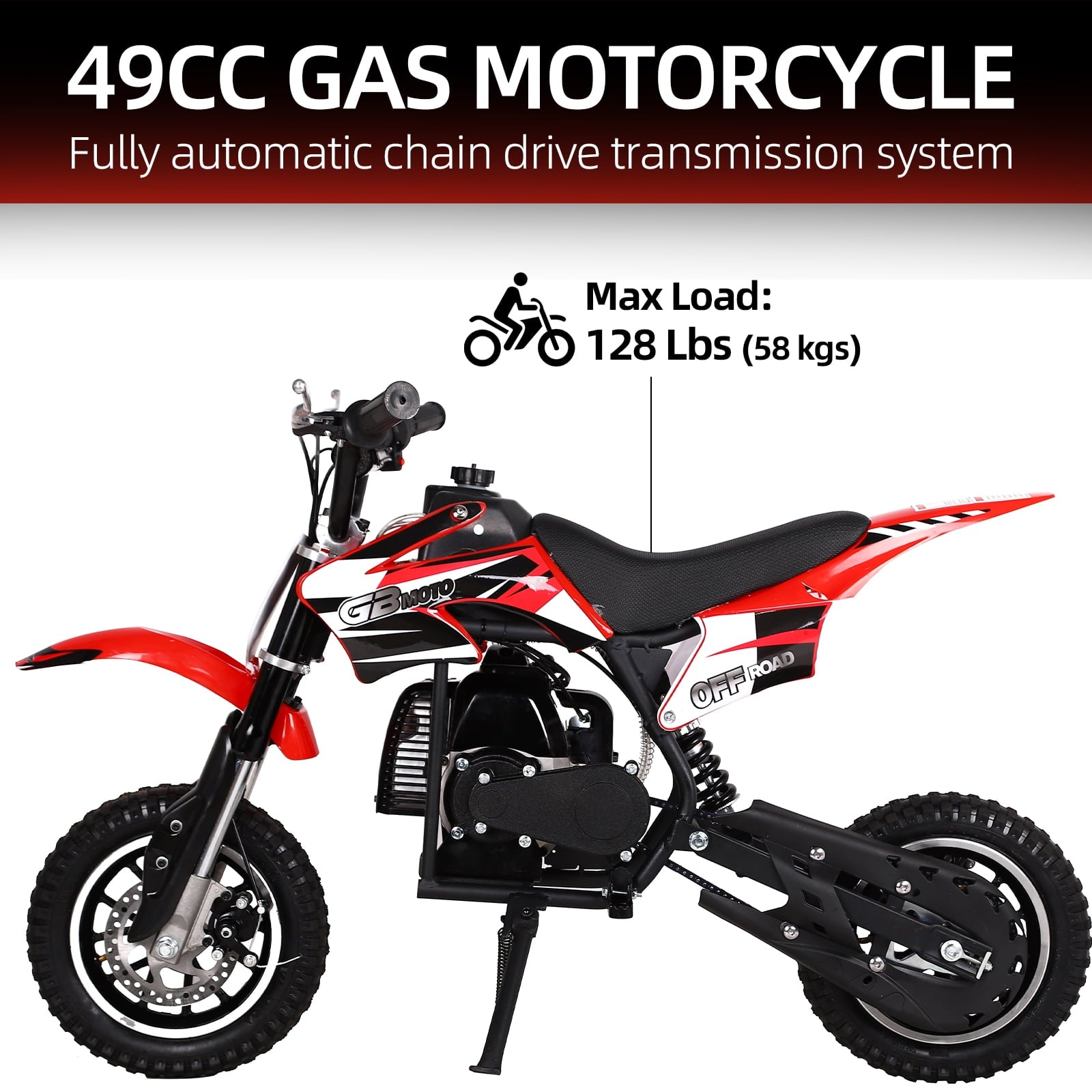 Our Track 7 49CC 2-Stroke Kid Dirt Bike, Off-Road Mini Dirt Bike Up to 20Mph, EPA Approved Kids Dirt Bike W/Rear Suspension, Kill Switch, Front & Rear Disc Brake, Gas Powered Dirt Bike. With 0.26 gallon full refuel, kids dirt bike will bring your kid adventurous journey on the road up to 27 miles per ride! Feel the unique sound that our gas dirt dirt bike gas gives to you! With a T8F chain drive transmission system, The dirt bike provides your unisex child optimal exercises to develop muscle strength! With shock absorption bearing provides a smooth and exciting ride even on rugged roads with the maximum speed 20 mph!