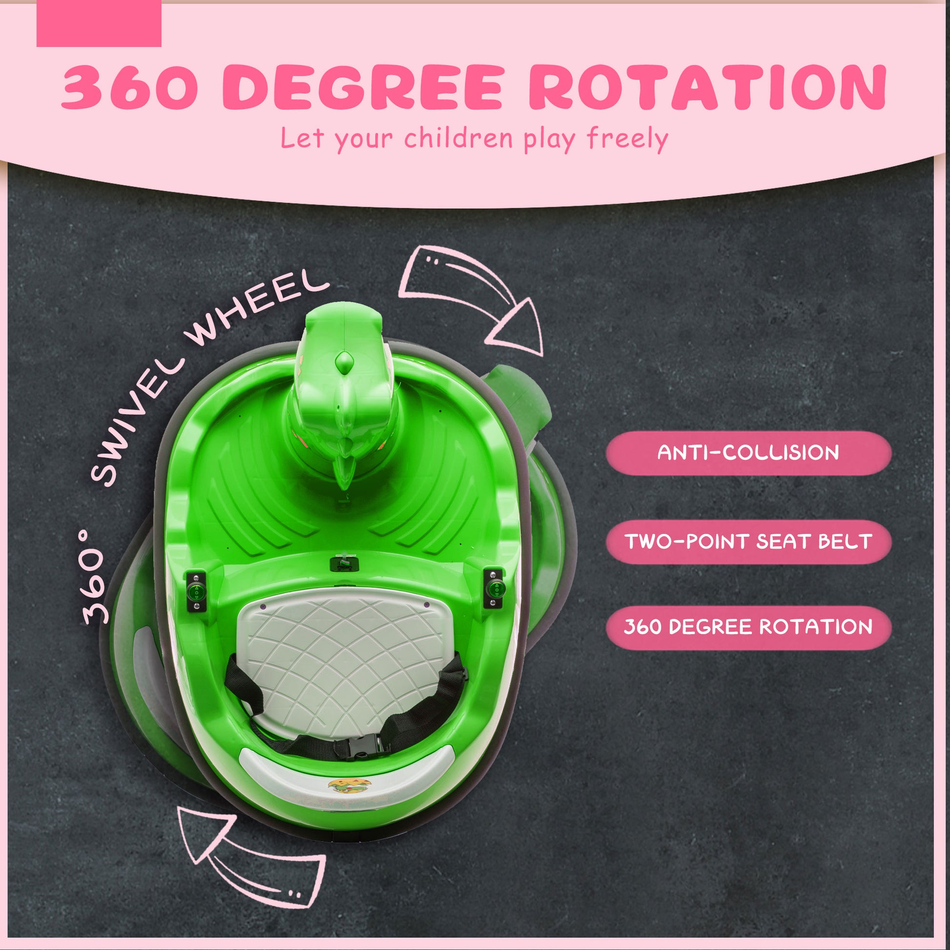 - 【Flexible Rotation and Powerful Performance】 With 360-degree free rotation, the bumper car offers agile and flexible steering, enhancing children's reaction skills and body coordination. The dual-motor drive system provides stable power, ensuring smooth operation and a safe yet thrilling bumper car experience for kids.
