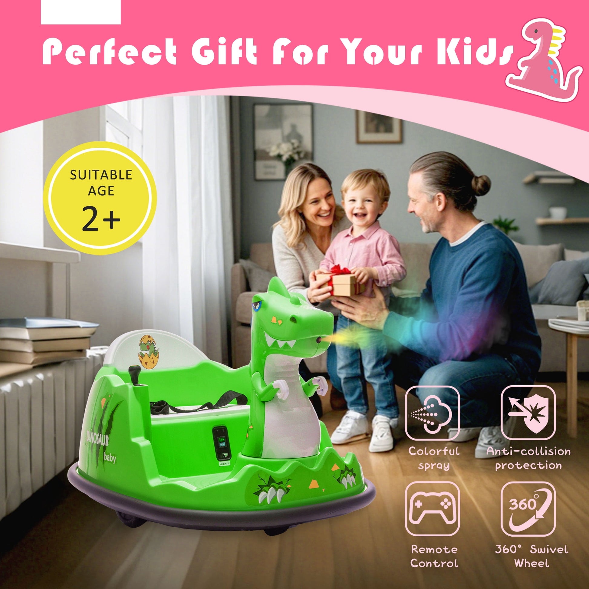 The Track Seven 12V Kids Ride-on Toy is a Ride-on toy for children aged 2-5. Designed with a captivating dinosaur shape, this bumper car-style ride-on combines fun, safety, and innovation. Its 360-degree rotation feature allows for spinning excitement, while the safety anti-collision strip ensures a secure playtime experience. The built-in music system keeps kids entertained with their favorite tunes, and the spray-with-light feature adds an extra layer of fun. The large-size seat design provides comfort for little ones, making it perfect for both indoor and outdoor use. With remote control functionality, parents can easily guide and supervise their child’s play.