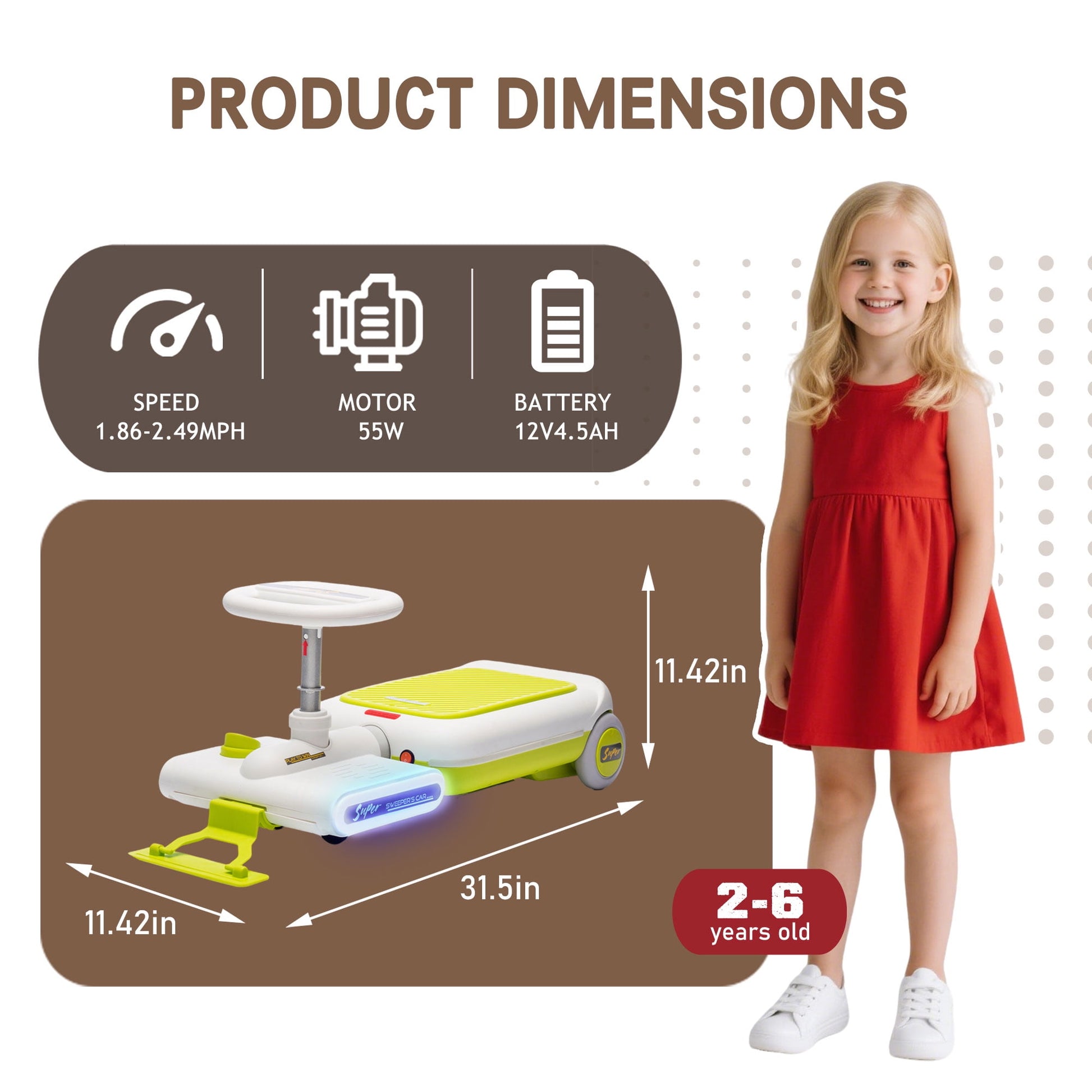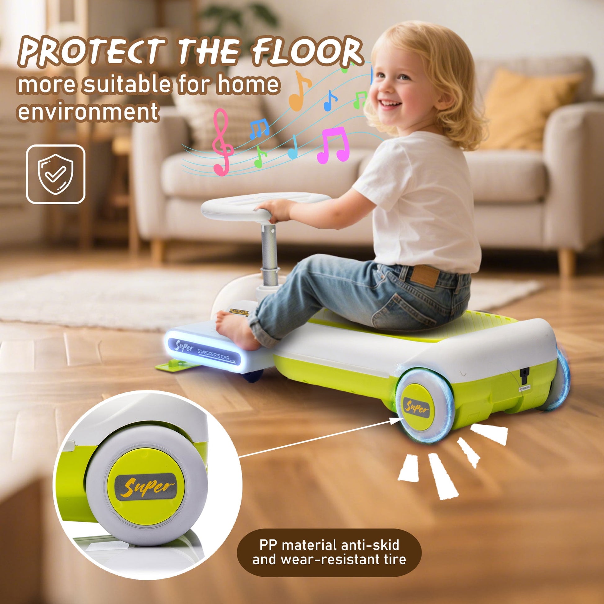【Go Kart Fun】Our Track Seven portable electric kart with LED flashing lights provide more fun for kids. Also it include removable mopping kit, can sweep floor, to clean while playing. Set up the mop board on the front and attach any cleaning rag. Note : That is not a professional cleaning tools, just kids car with funny function.