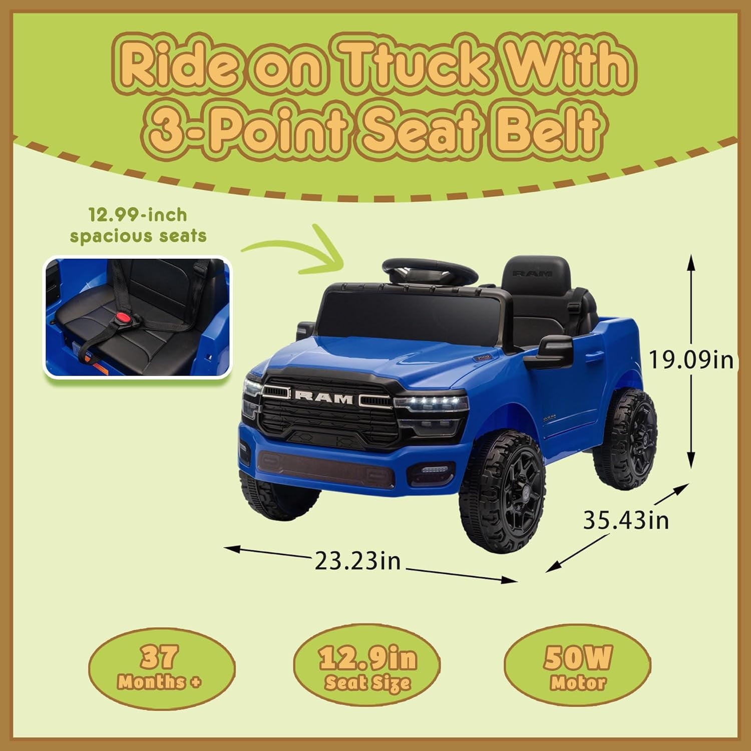 Track Seven 12V Ride on Car, Licensed Dodge RAM 3500 Ride On Truck with Remote Control, Rear Shock Suspension, LED Headlights, Low Battery Alarm, Bluetooth, Music, Ride on Toy for Kids Aged 3+, Blue