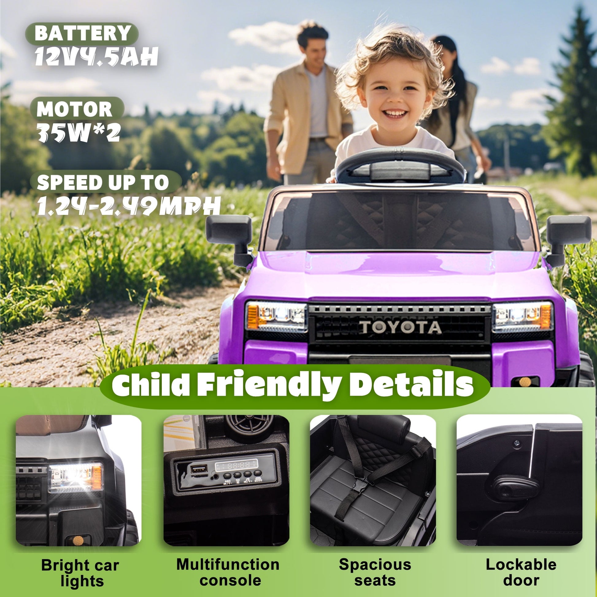 - 【Officially Licensed Toyota LC250 Ride on Car】The 12v ride on truck is designed to replicate the iconic Toyota LC250, allowing kids to enjoy a realistic driving experience just like their parents’ favorite SUV! It's also very close to the full experience with LED lights, startup sounds, high and low speed adjustment, 4 wear-resistant wheels, doors that fully open and close to deliver an authentic driving experience that kids are sure to love.