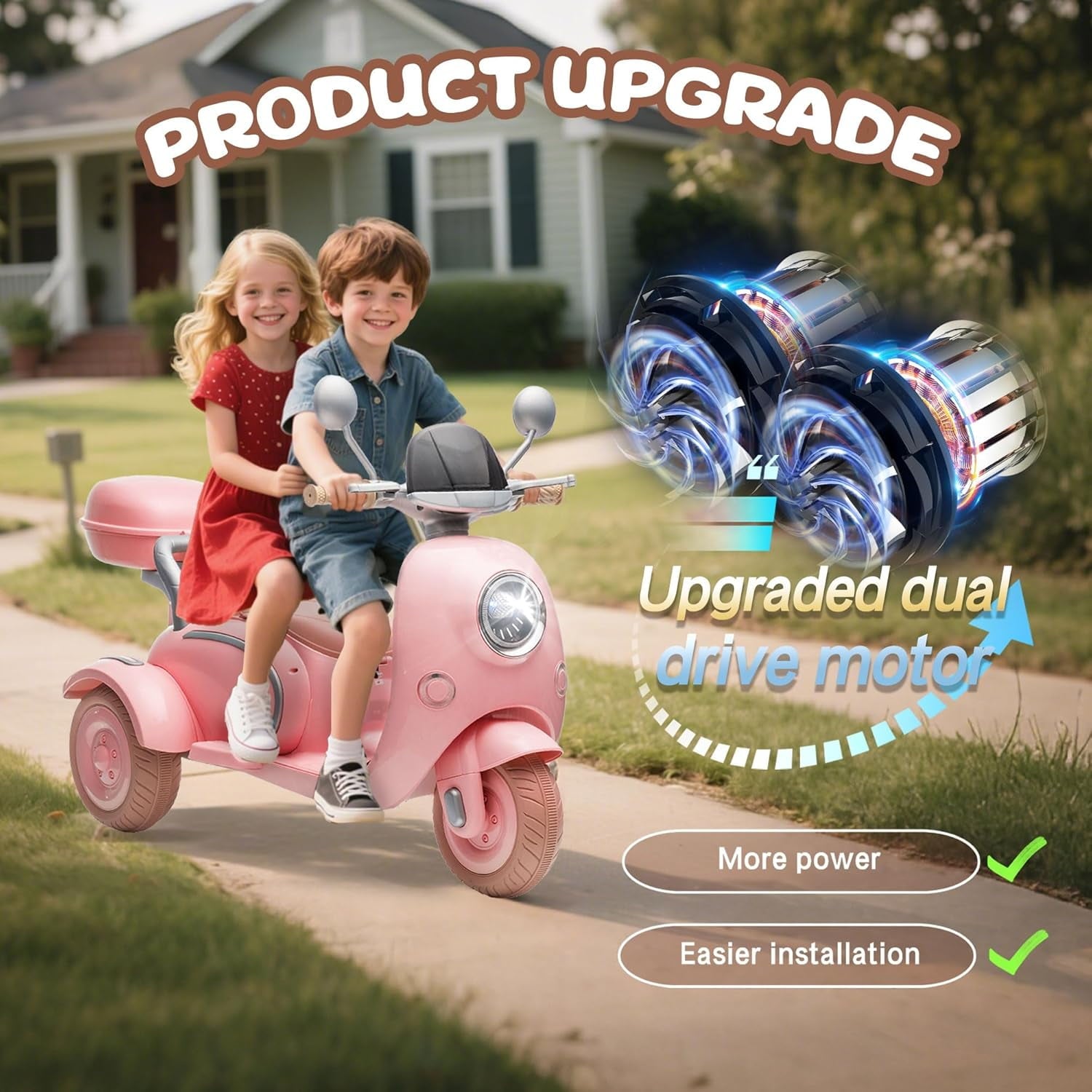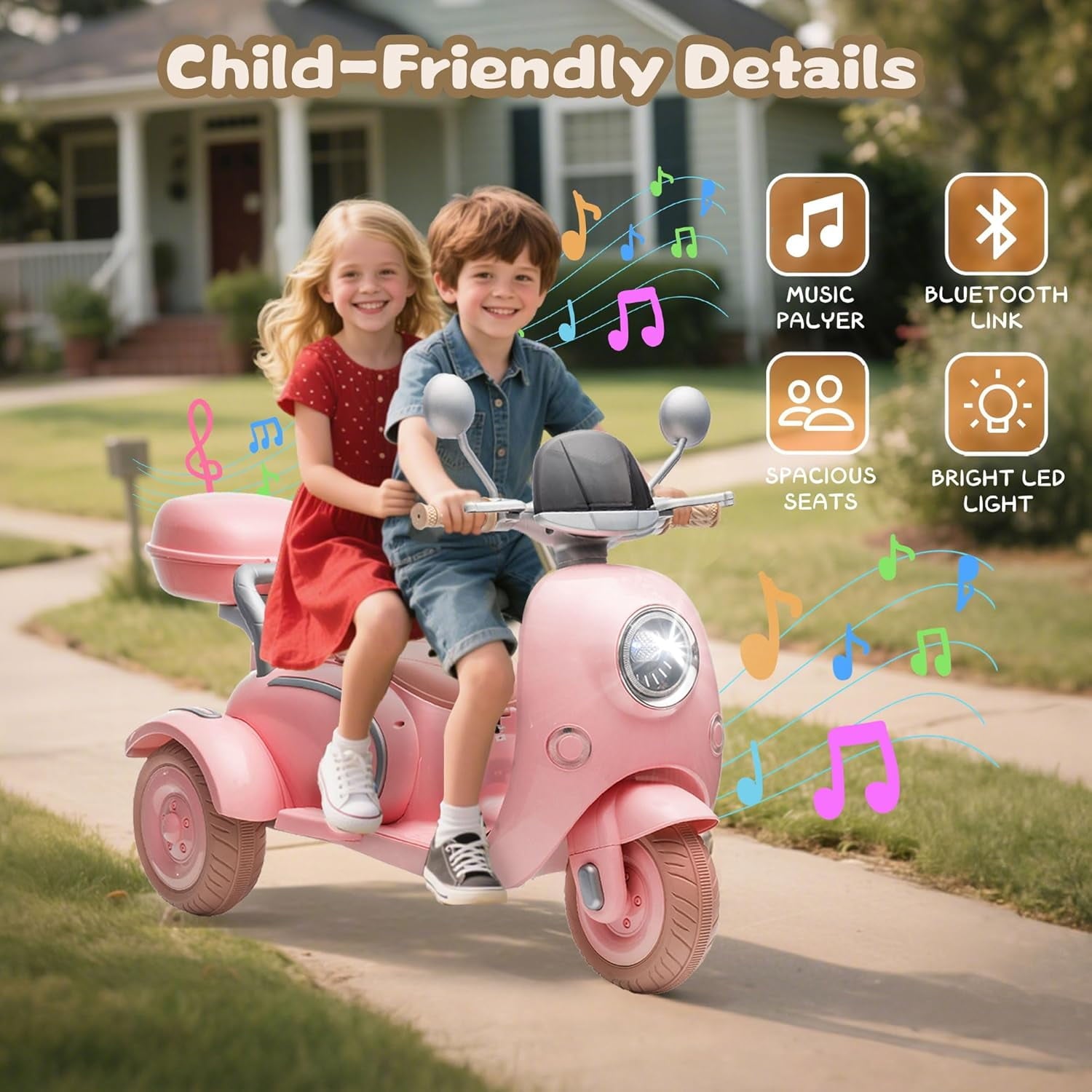 Track Seven 12V Ride on Motorcycle, 2-Seater Electric Motorcycle with Dual Motor, 3 Wheels Motorbike with Bluetooth, LED Lights, Storage Box, Front Hook, Ride on Toy Car for Boys Girls Aged 3+, Pink