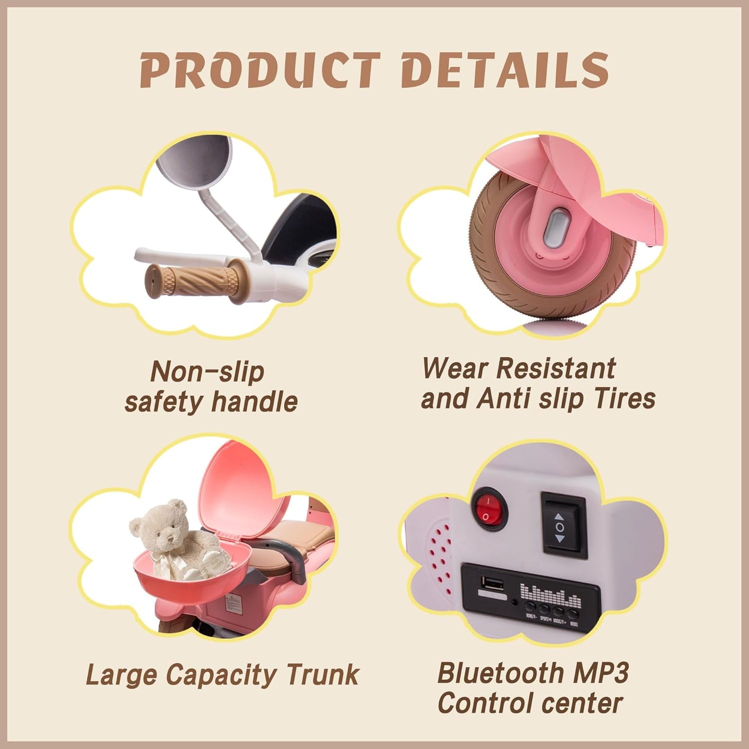 - 【Music & Bluetooth】Our kids ride on toys car features a built-in multifunctional player and a USB port for connecting external devices, providing a richer entertainment experience. Children can enjoy their favorite music while riding the kids motorcycle by connecting to Bluetooth devices, making every ride more enjoyable and fun.