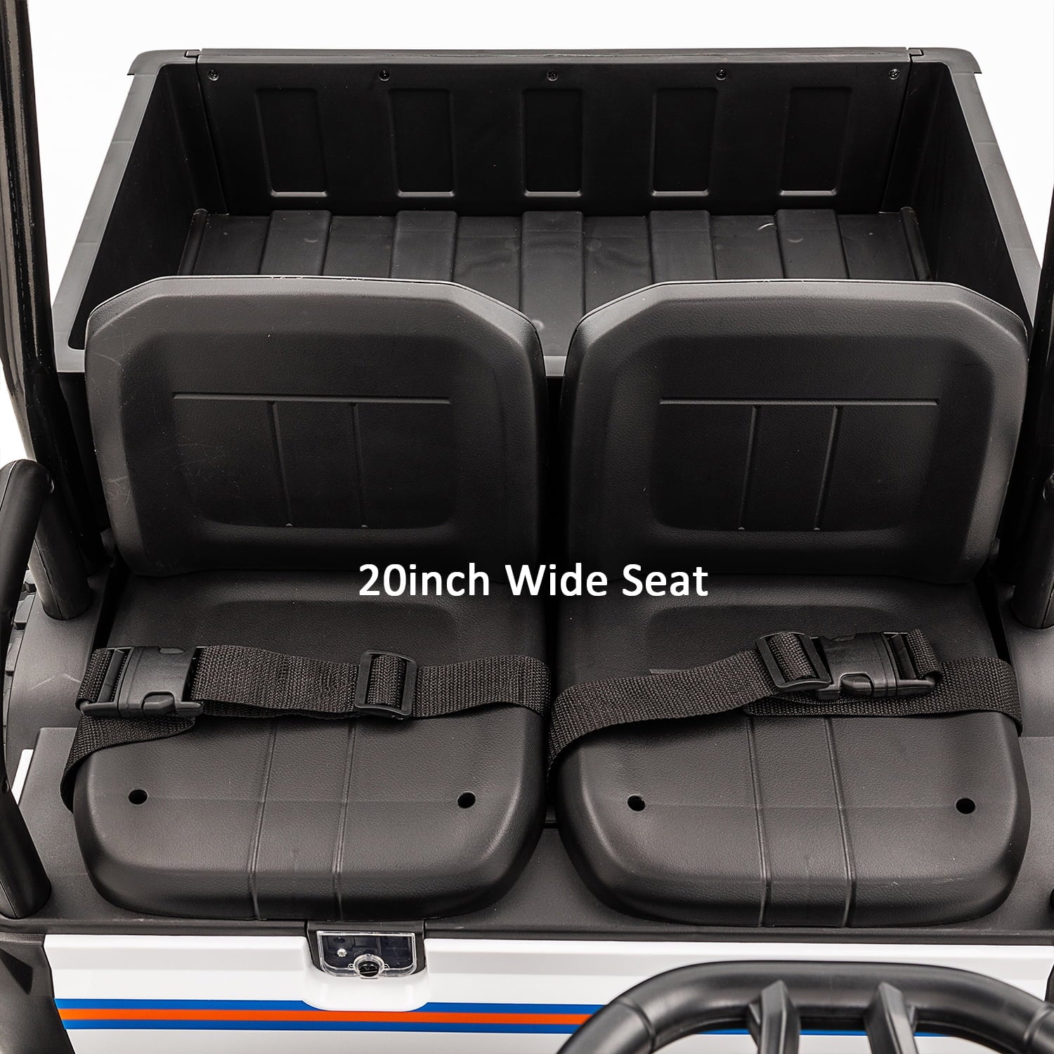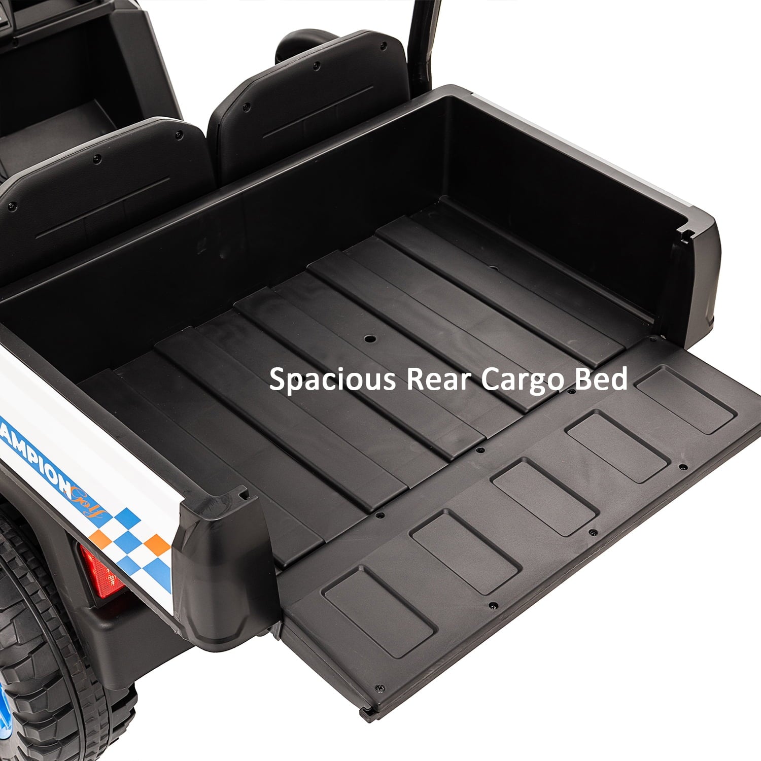 Our 24V XL Kids Electric Ride on Truck w/remote control. Sharing has never been more joyful! The extra-wide, cushioned dual seats provide a comfortable ride for two young passengers. The ergonomic backrest design ensures comfort even during long rides. Each seat features individual safety belts. The plastic seat stays comfortable withstands sun and rain. A mobile music classroom! Connect your phone to play nursery rhymes, bedtime stories, or English children's songs, helping kids learn while having fun. The finely tuned audio system delivers clear sound at safe