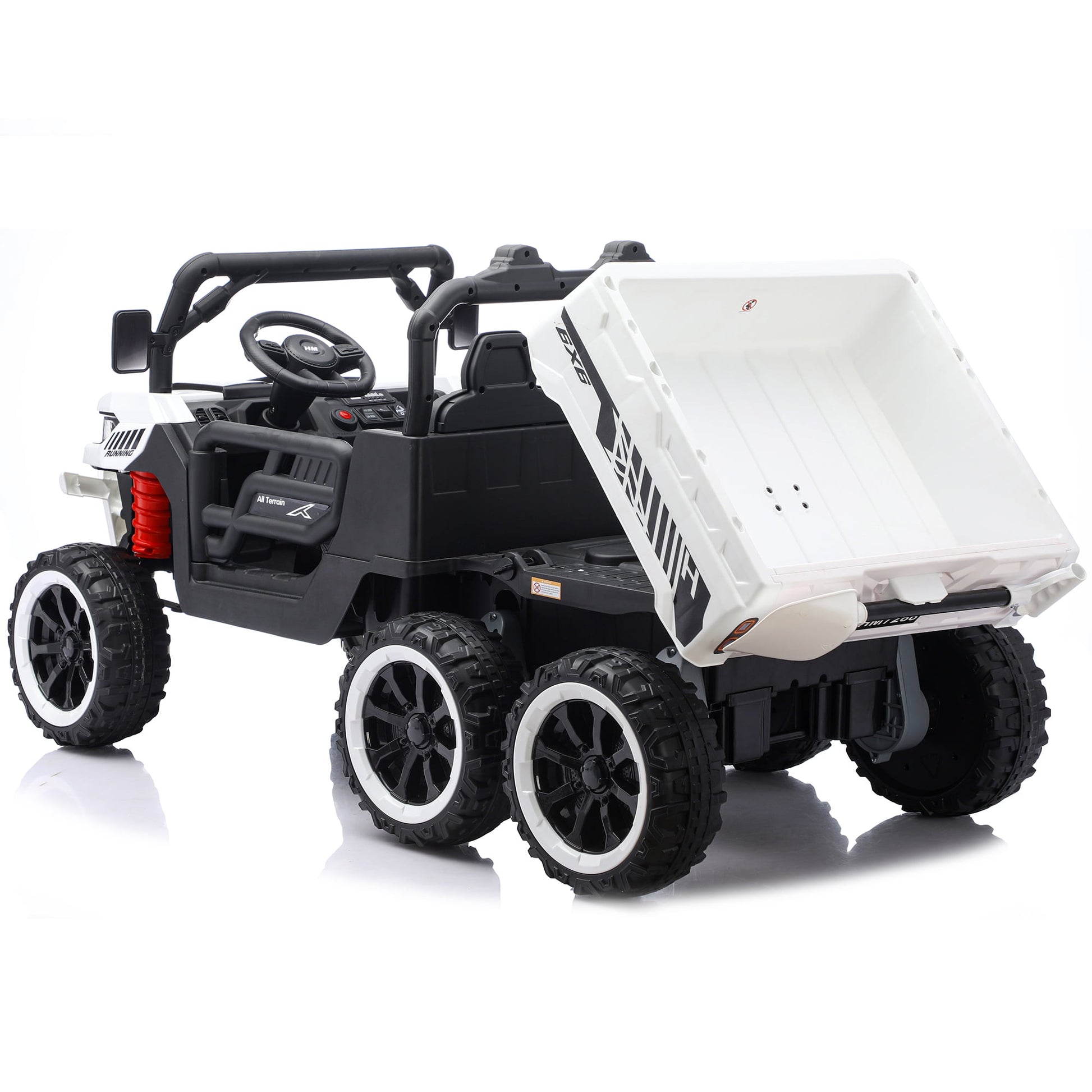 - 【Powerful Performance】This 24V electric ride on truck packs 4x100W motors and true 4WD traction. Conquer various terrains with 6 heavy-duty wheels while maintaining safe 5mph speed (parent-controlled high/low modes). The 24V 7Ah battery provides 1+ hours of playtime and supports 132lbs capacity – perfect for two kids sharing adventures or hauling toys in the oversized dump bed!