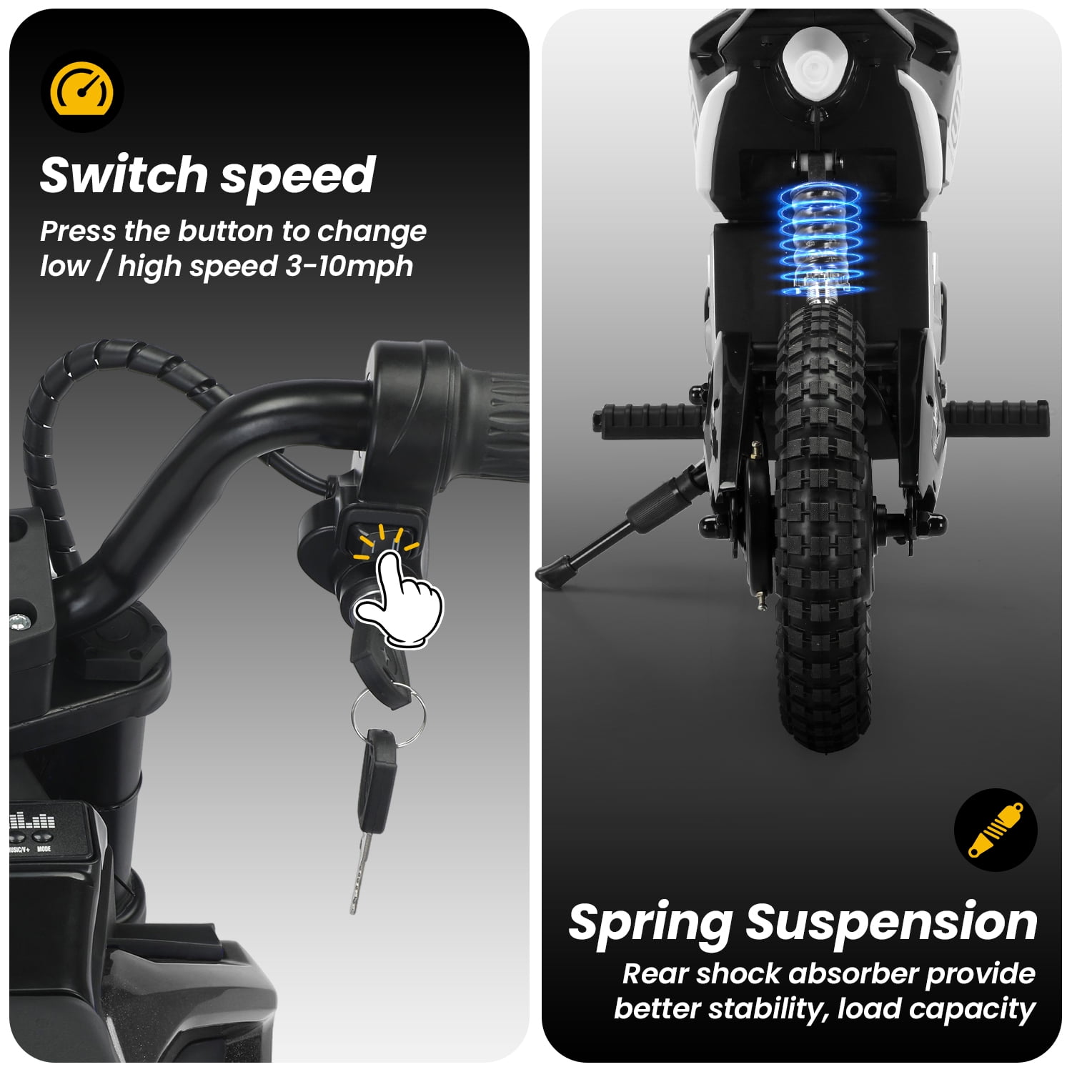 - 【Safety First】The electric dirt bike is equipped with a highly flexible suspension system, which has super shock absorption ability, which can reduce the impact of road bumps on the driver and ensure the safety of children. Electric motorcycle for kids age 5-15 years.