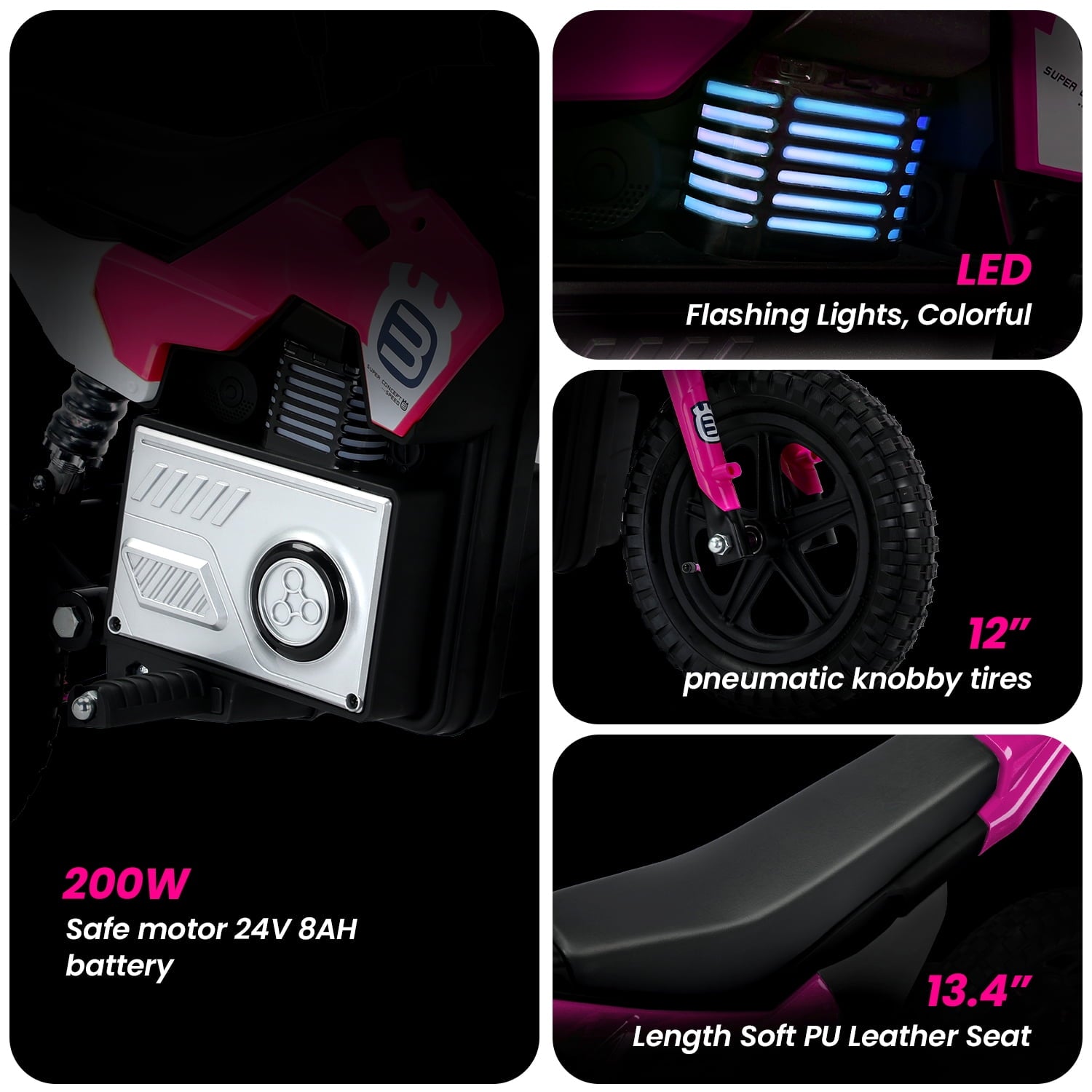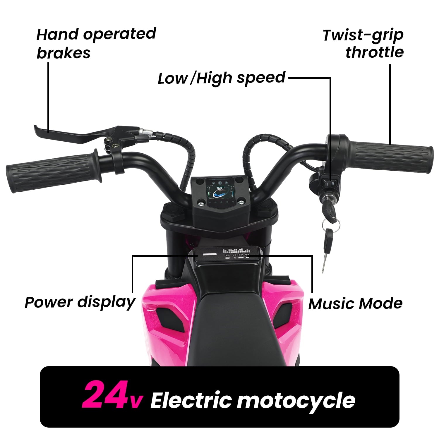 Track Seven 24V Electric Dirt Bike, 200W Motocross Ride on Motorcycle with Hand Operated Brakes, Adjustable Speed, LED Lamp, Music, Max Speed 10mph, Electric Motorcycle for Kids Age 5+, Pink