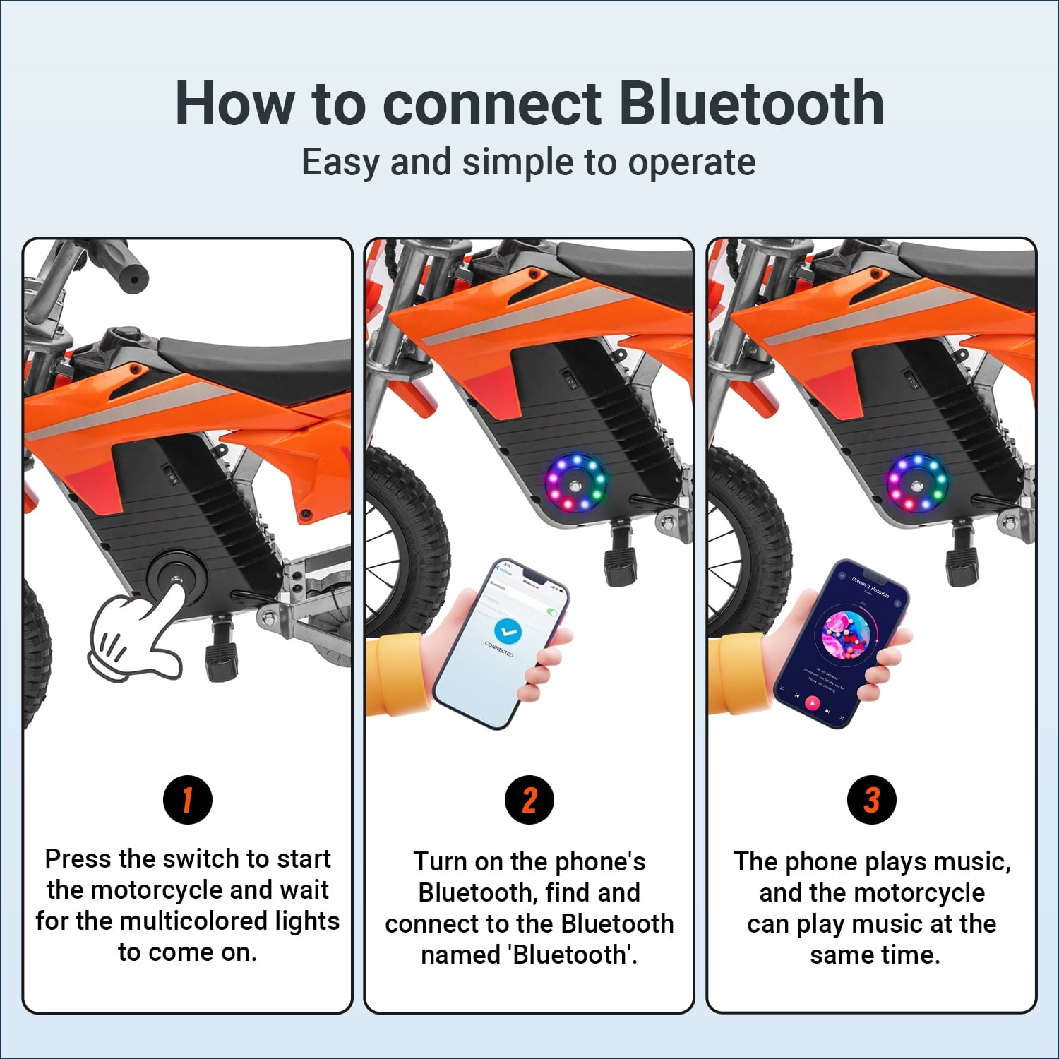 - 【Magic Electric Dirt Bike 】 Be the coolest rider on the block! Dynamic LED lights on both sides create a glowing halo around wheels after sunset. Bluetooth speaker syncs with favorite songs - perfect for driveway dance parties or weekend camping adventures.