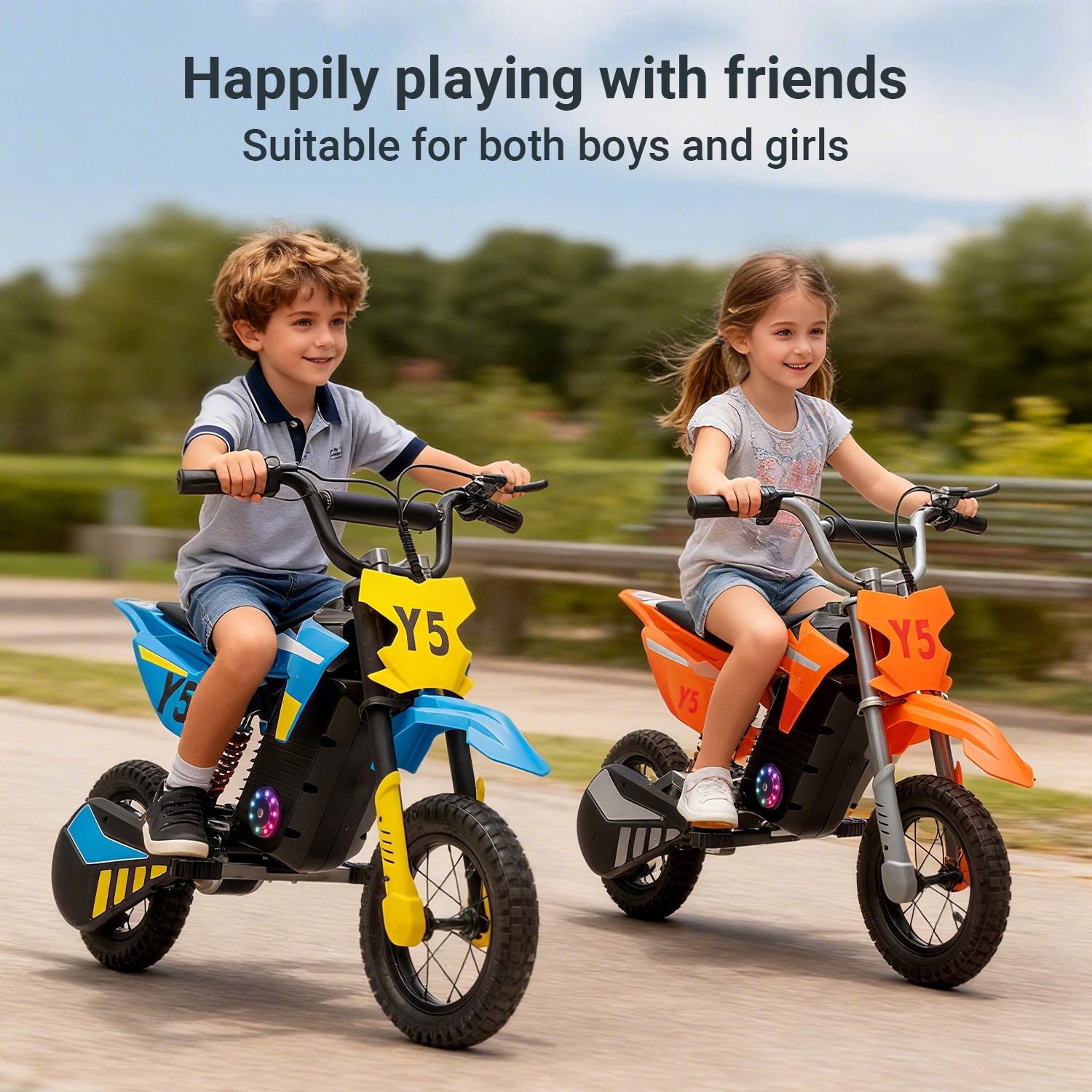 • 【Magic Electric Dirt Bike 】 Be the coolest rider on the block! Dynamic LED lights on both sides create a glowing halo around wheels after sunset. Bluetooth speaker syncs with favorite songs - perfect for driveway dance parties or weekend camping adventures.