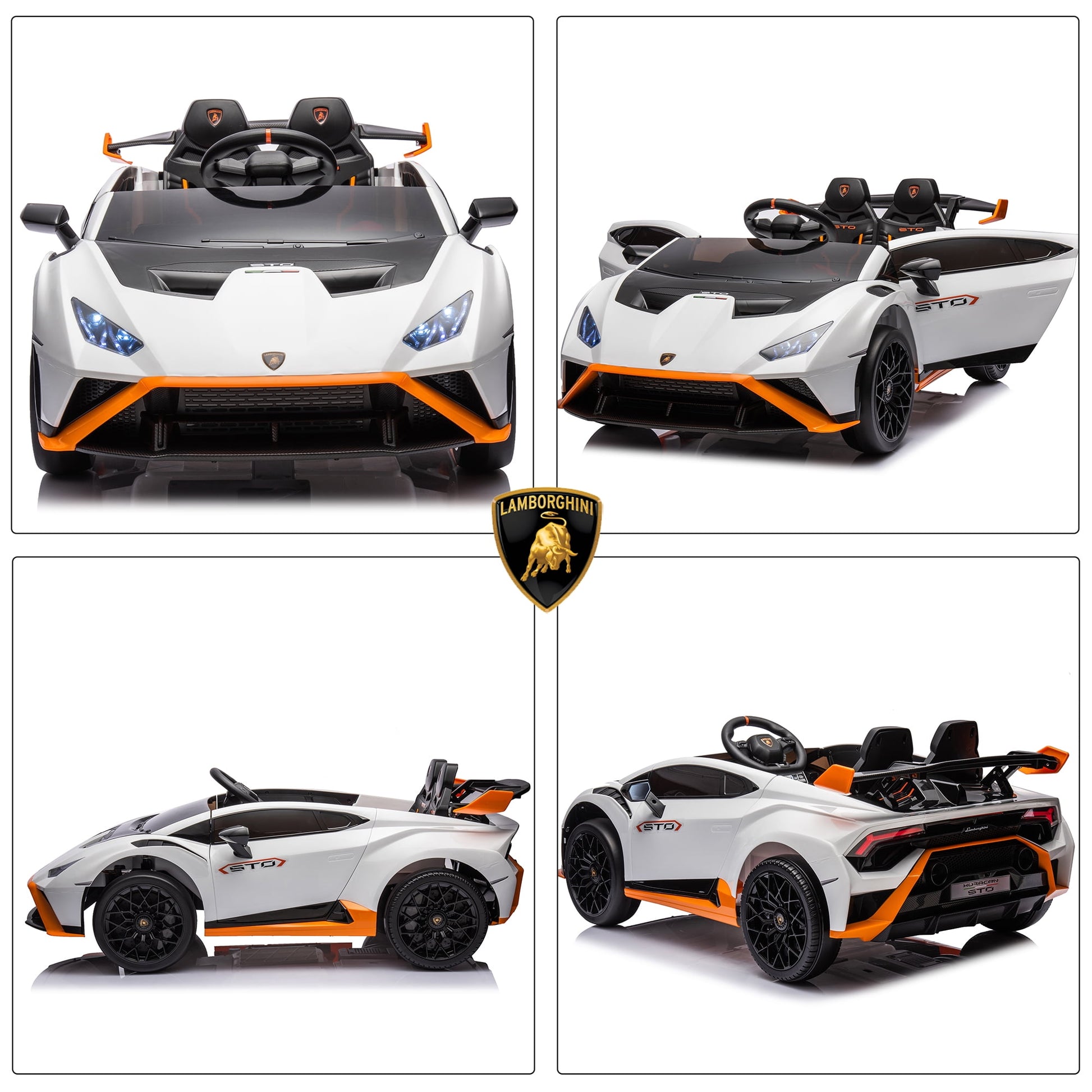 Track Seven 24V Kids Ride on Car, Licensed Lamborghini STO Electric Car for Boys Girls, 2-Seater Ride on Drift Car with Remote Control, Music, 360° Spin, Max Speed 6mph, White