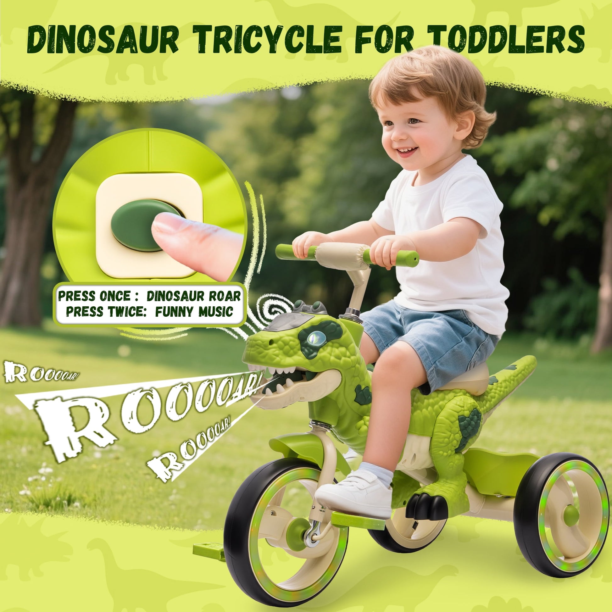 - 【Cool Dinosaur Design】This kids tricycle features a cute dinosaur design. When turned on, it emits realistic dinosaur roars and fun music, instantly grabbing kids' attention! (Button--press once is dinosaur roars, press twice is music, which need 3x AA battery-do not include).